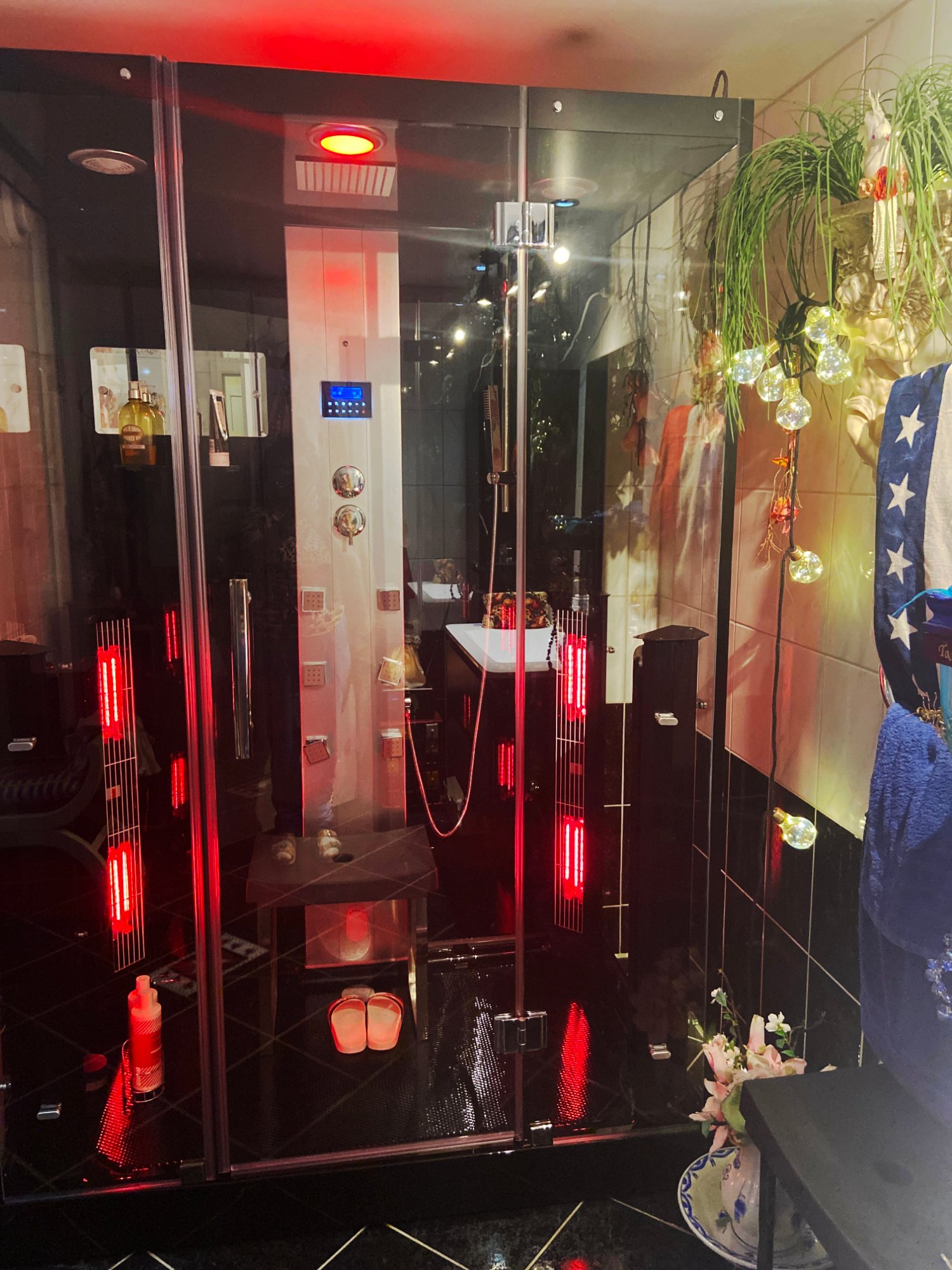 De infrarøde varmeelementene er vanntette og svært sikre I bruk! Du kan dusje selv om de er varme uten problemer. Man velger enten infrarød badstue eller steambad, de kan ikke kombineres.