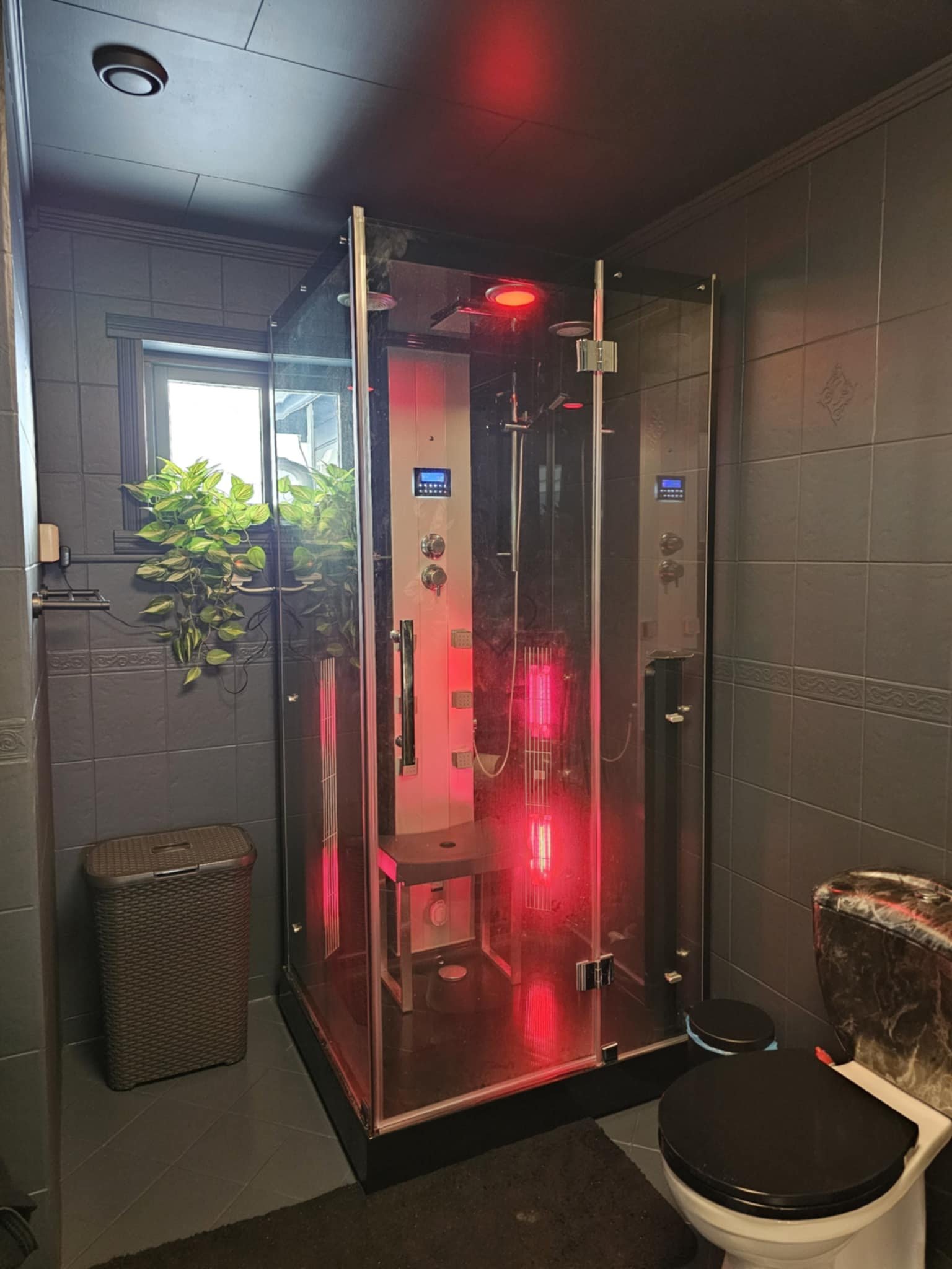 Nyt troperegn, massasjedyser, steam og infrarød sauna i ett og samme kabinett! Utstyrt med terapilys for avslapning og velvære. Steamsauna i moderne svart design.